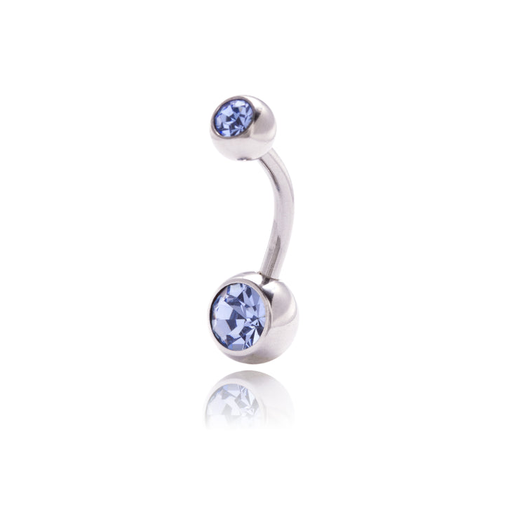 Design: Haste curva com duas extremidades rosqueáveis, ambas adornadas com uma Zircônia (Strass) Azul Claro fixada em cravação de bezel (totalmente envolvente), que garante segurança e brilho. O design curvo de 1.6mm de espessura é o calibre padrão. O comprimento é versátil (tipicamente P ou M).