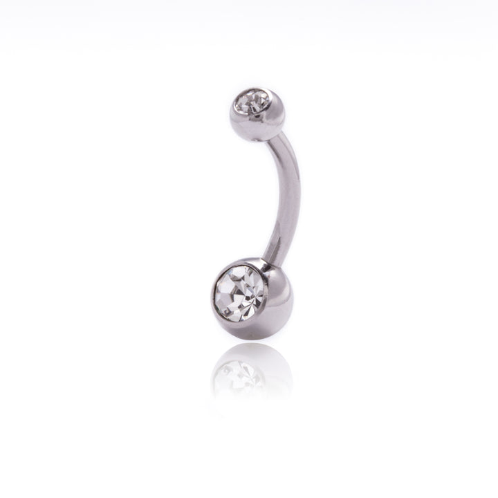 Design: Haste curva com duas esferas rosqueáveis cravejadas com Strass (pedras de brilho). O design curvo de 1.6mm de espessura é o padrão para o umbigo e outras perfurações corporais curvas.