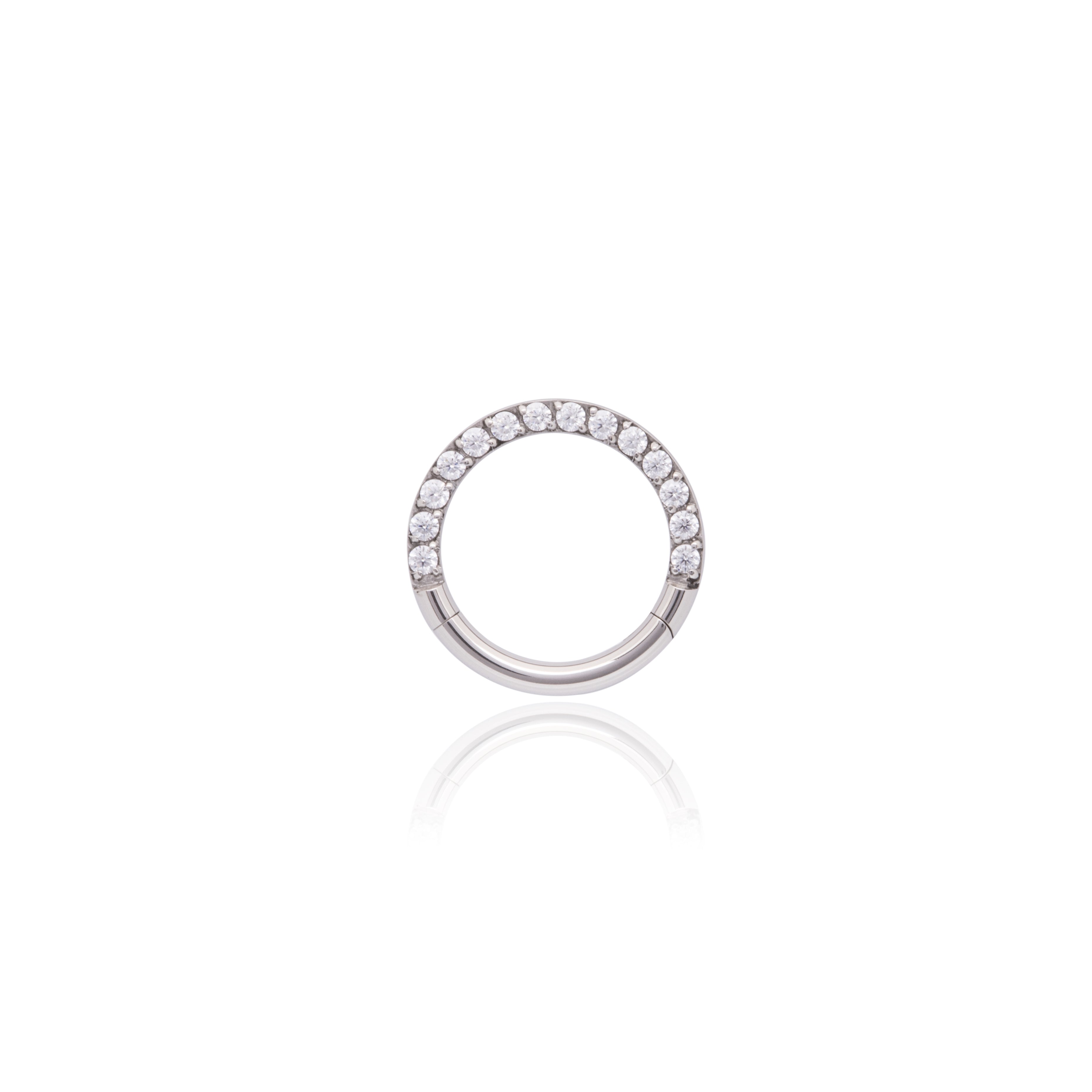 Esta Argola Segmento Clicker é a joia cravejada mais clássica, ideal para quem busca um brilho contínuo e elegante na perfuração. O design de fileira única é versátil e atemporal.