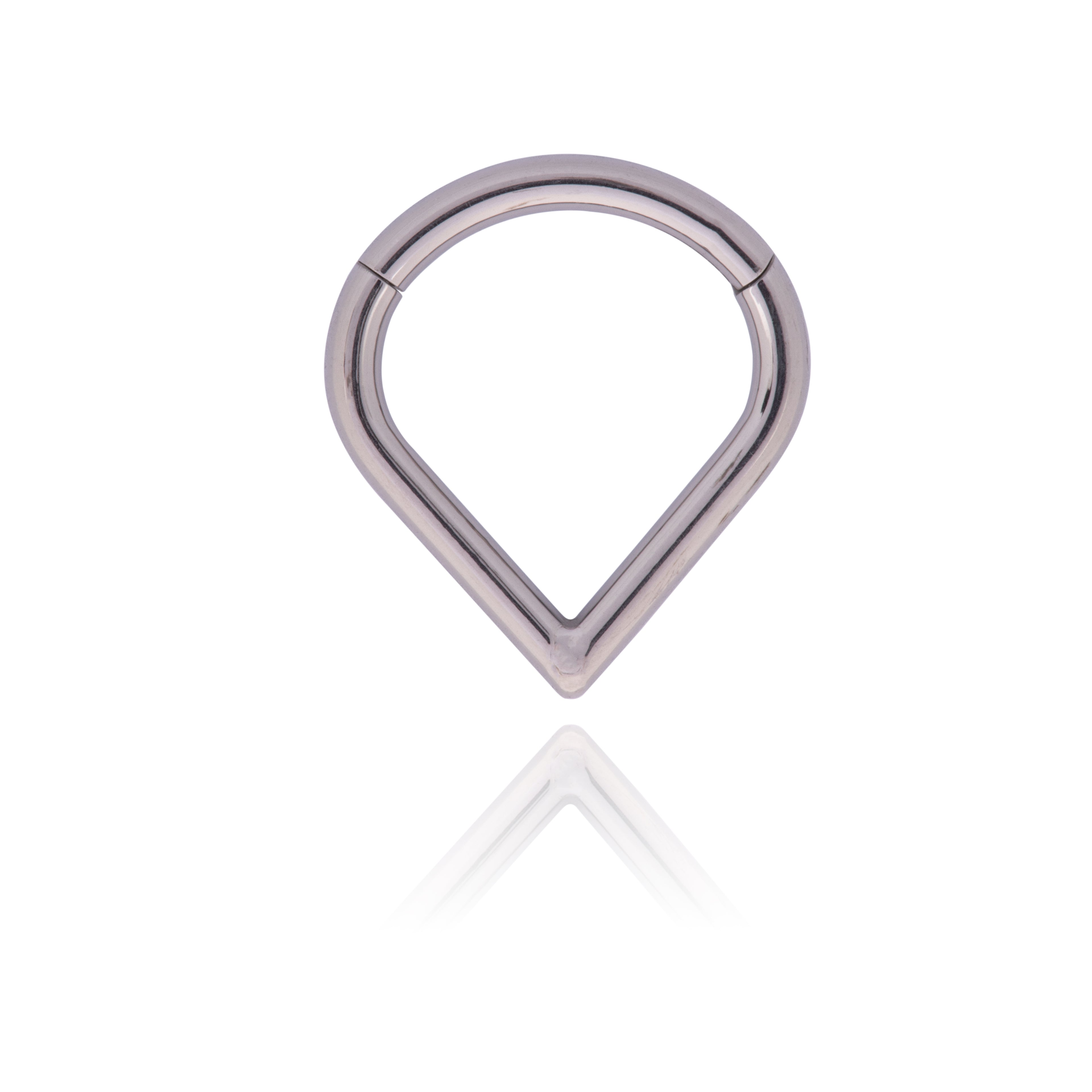 Esta Argola Segmento Clicker possui um design geométrico e angular, em formato de Gota (Lágrima) ou 'V' invertido. É uma joia moderna e lisa, ideal para criar um visual distinto que se destaca do tradicional formato circular.