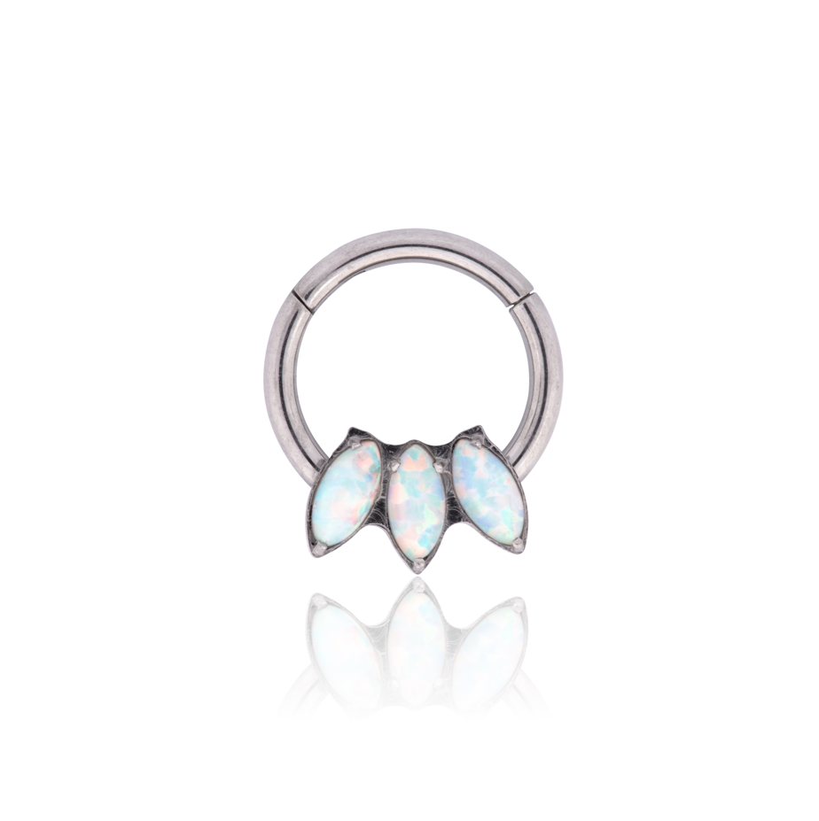 Design: Argola com Fecho Clicker Articulado. O arco inferior da argola é decorado com um Cluster (agrupamento) de três Opalas Sintéticas (geralmente Azuis/Brancas) lapidadas em formato Navete (formato de pétala). O design é aberto na base, maximizando a visibilidade das gemas. O diâmetro de 8mm oferece um ajuste compacto.