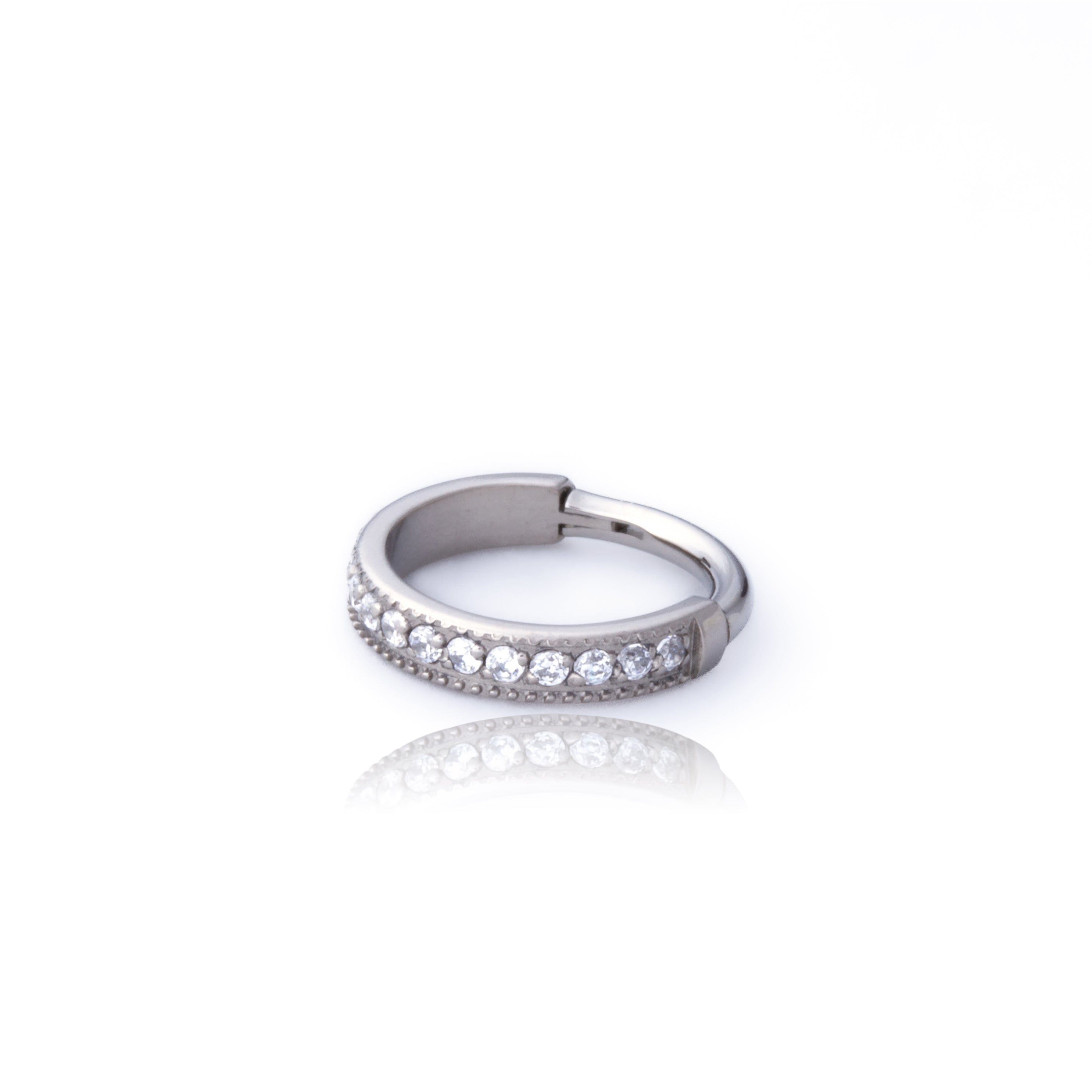Ideal para: Perfurações que se beneficiam de uma argola de destaque e brilho frontal, como Daith (onde o arco cravejado fica visível no arco interno), Septo e Hélix.