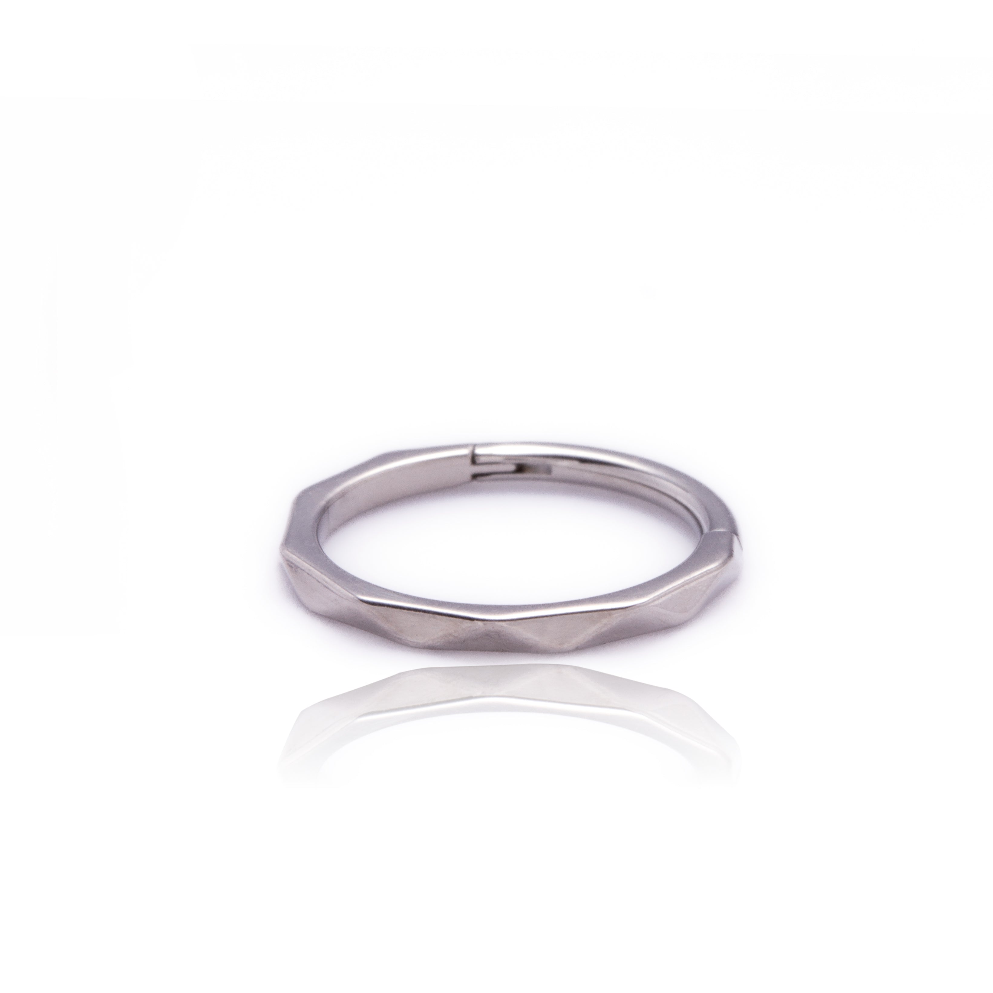 Design: Argola com Fecho Clicker Articulado. O corpo da joia é facetado com múltiplos ângulos que simulam uma lapidação, criando um visual robusto e texturizado. O diâmetro de 10mm é um tamanho versátil e que oferece destaque.