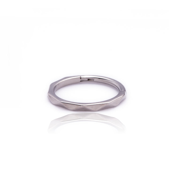 Esta Argola Segmento Clicker é uma joia statement com um visual moderno e único. O design Lapidado (Facetado) confere à argola um acabamento geométrico e tridimensional, que reflete a luz de forma angular e marcante.