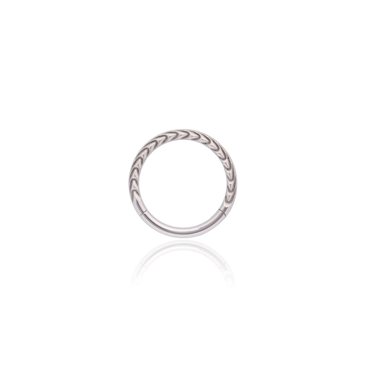 Estilo: Arrojado, Minimalista-Texturizado e Funcional. O Titânio garante a segurança, enquanto o design texturizado oferece uma alternativa única às argolas lisas ou cravejadas.