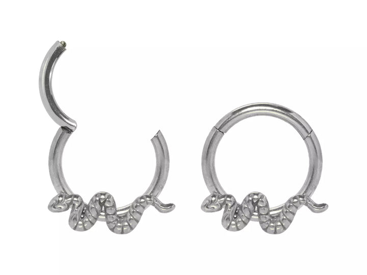 Esta Argola Segmento Clicker é uma joia de design ousado e temático, ideal para quem busca um acessório que represente transformação e destaque-se na orelha. O design em Cobra (Snake) é esculpido na face frontal, adicionando um toque de luxo.