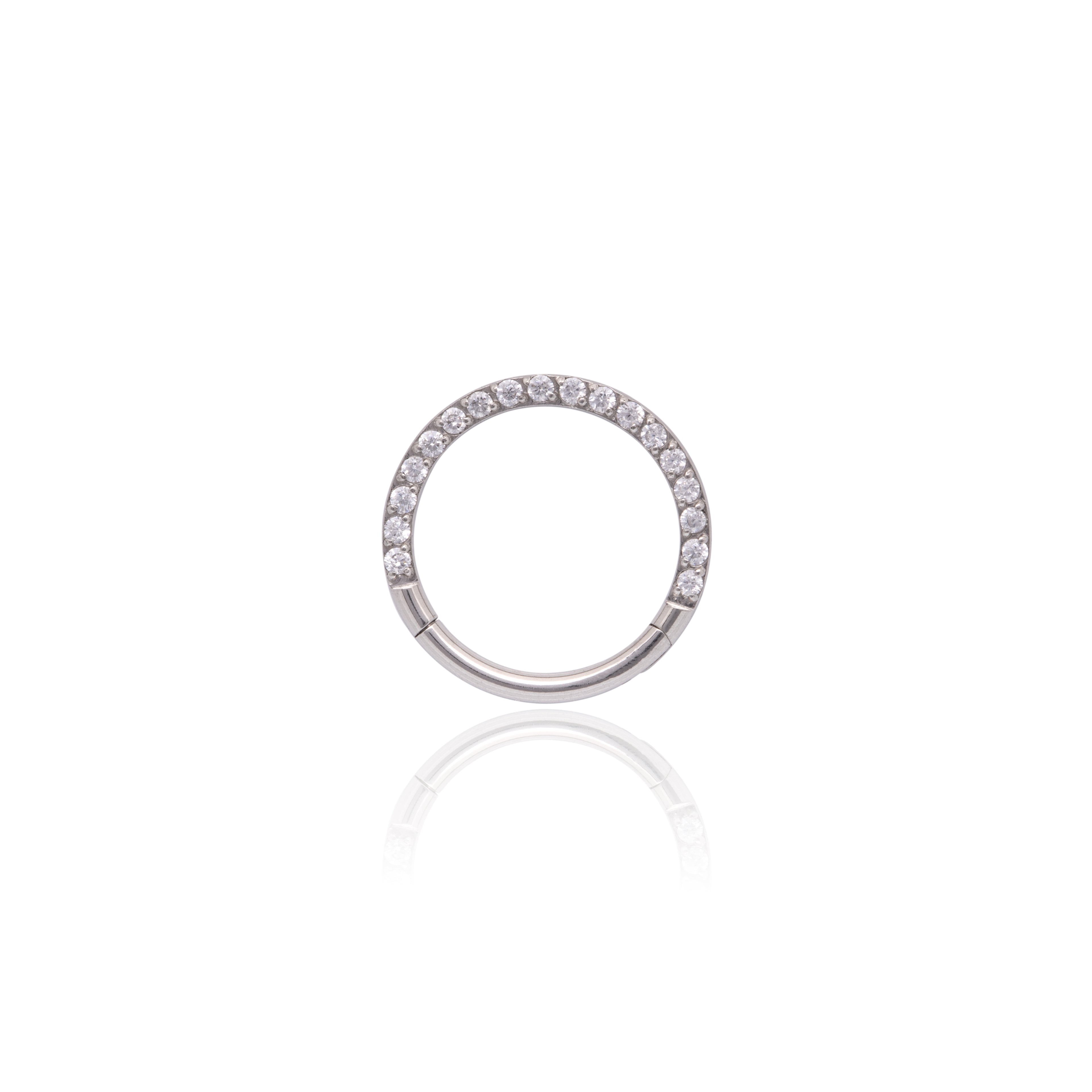 Esta Argola Segmento Clicker é uma joia de destaque e praticidade. O design frontal cravejado transforma a argola básica em um acessório luxuoso e brilhante, ideal para quem busca uma peça statement e de fácil manuseio.