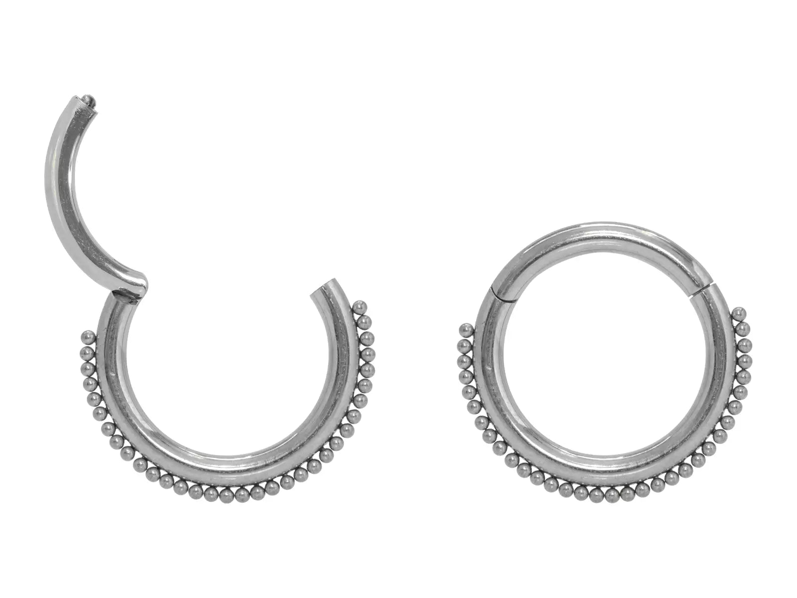 Esta Argola Segmento Clicker é uma joia de design altamente detalhado, conhecida no mercado como estilo "Indian Bead" (Bolinhas Indiano). Ela utiliza uma fileira de esferas de aço cravejadas ao longo da borda inferior da argola.