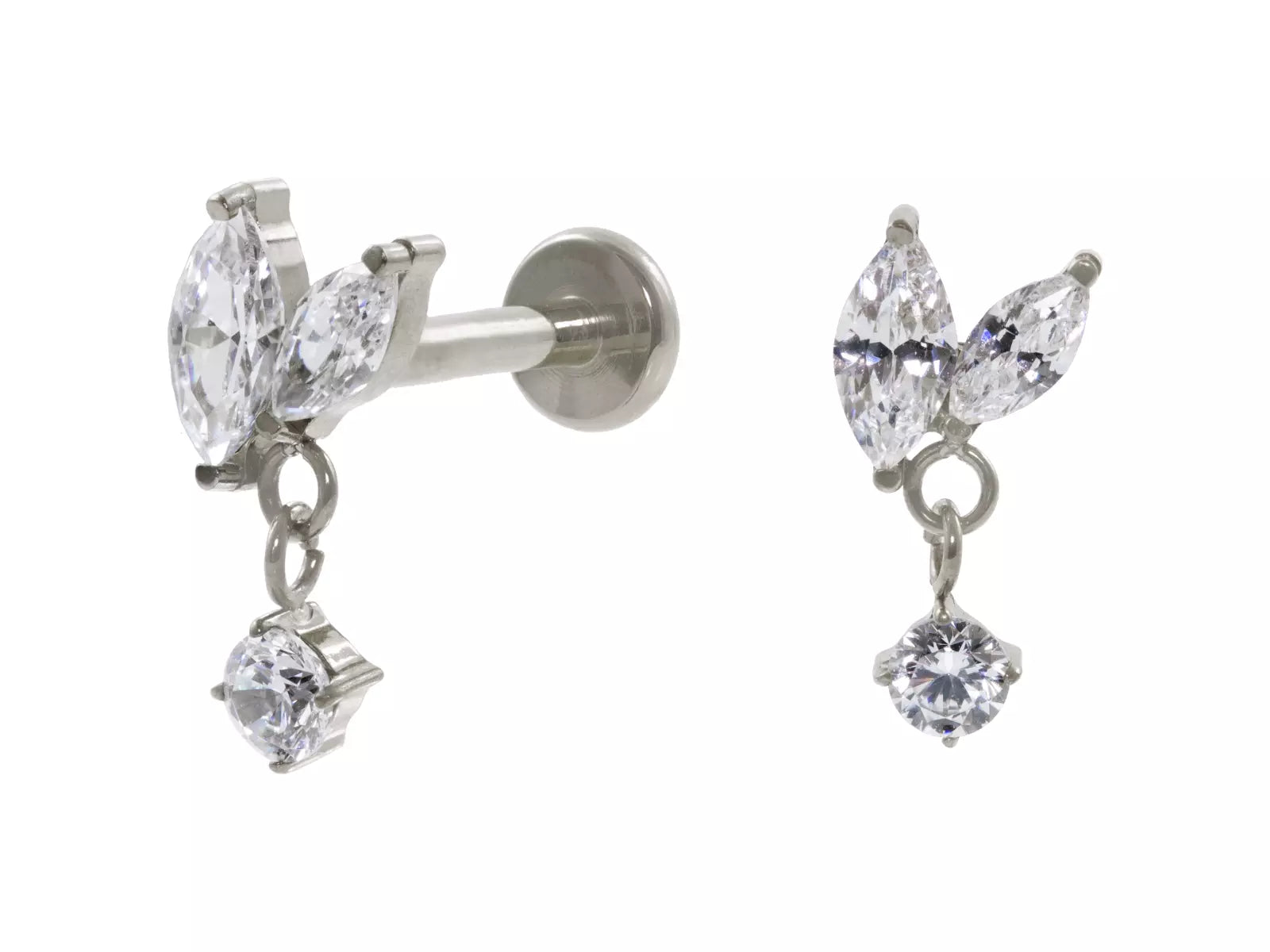 Design: Haste reta com Rosca Interna (R/I). O topo principal é um Cluster de Zircônias lapidadas em formato Navete (pétalas), alinhadas para imitar uma folha ou flor. Deste cluster pende, por meio de uma argola, um Penduricalho (pingente) com outra zircônia cravejada, adicionando movimento e brilho em cascata.