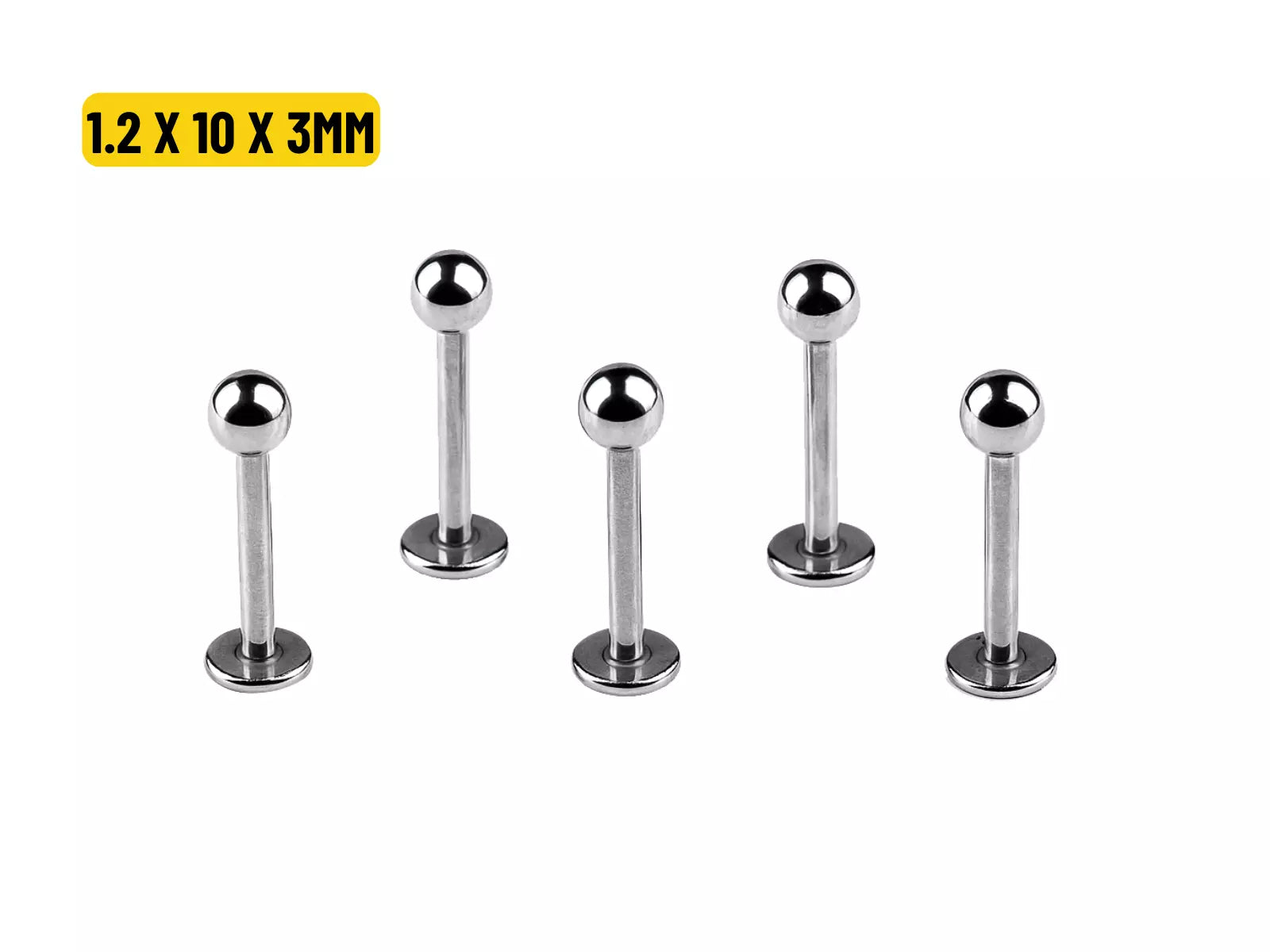 Design: Haste reta com base plana (Labret) e topo de Esfera (3mm) rosqueável. Este design é ideal para evitar atrito atrás da orelha e possui o comprimento de 10mm.