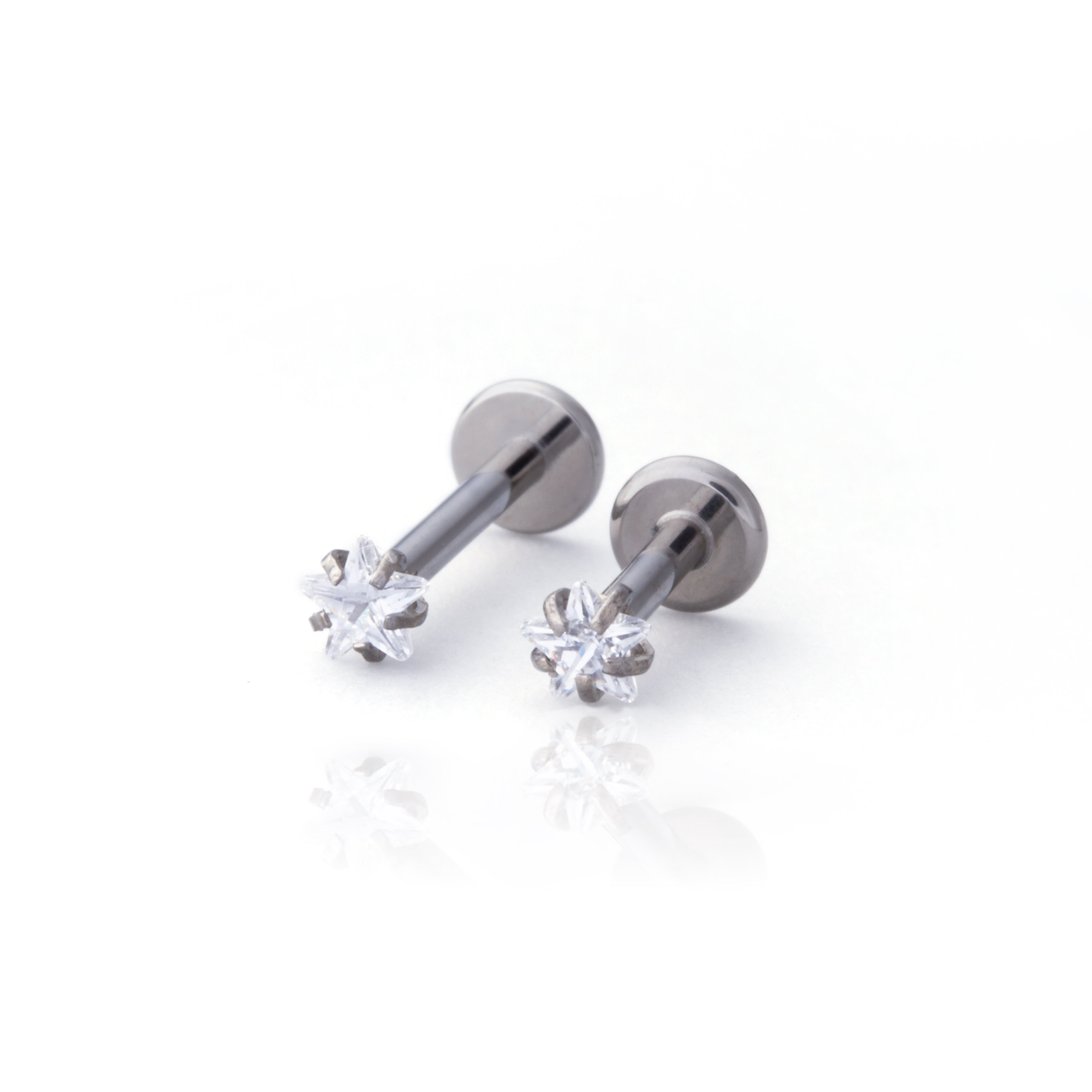 Este Labret é uma joia charmosa e moderna que combina um formato lúdico com a segurança e o brilho do titânio. O topo em Estrela é detalhado com uma ou mais zircônias, criando um ponto de luz celestial que se destaca na cartilagem.
